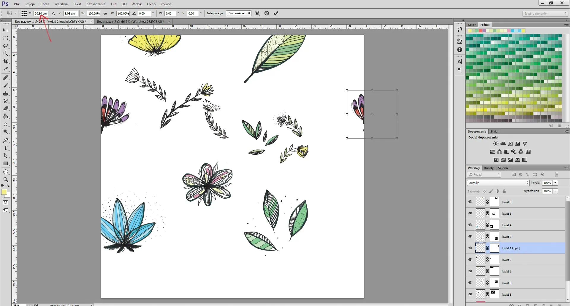 Elige centímetros en la herramienta Regla en la parte superior. A continuación, copia la capa con el elemento (la flor) a la izquierda. Pulsa CTRL+T y cambia la posición del elemento copiado en el eje X (el horizontal) unos 30 cm. Las herramientas para cambiar la posición del elemento se pueden encontrar en la esquina superior izquierda (ver la imagen). Haz lo mismo con otros elementos terminales.