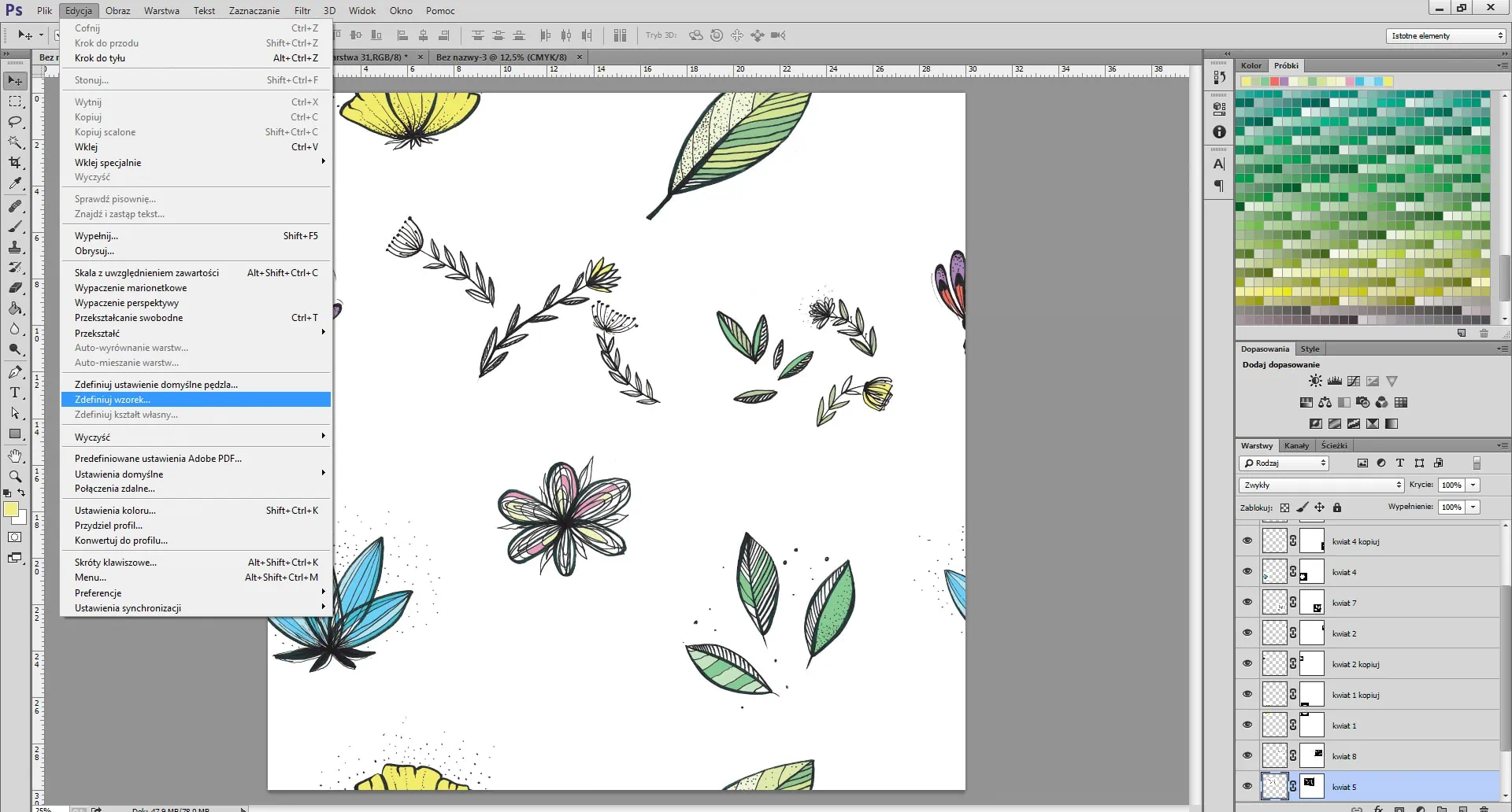 Antes de enviarnos tu archivo, puedes verificar si el patrón es perfecto. Despliega el menú Editar y selecciona Definir patrón. Haz un nuevo archivo, por ejemplo 50×50 cm. El tamaño del archivo debe ser mayor que el tamaño de tu diseño.