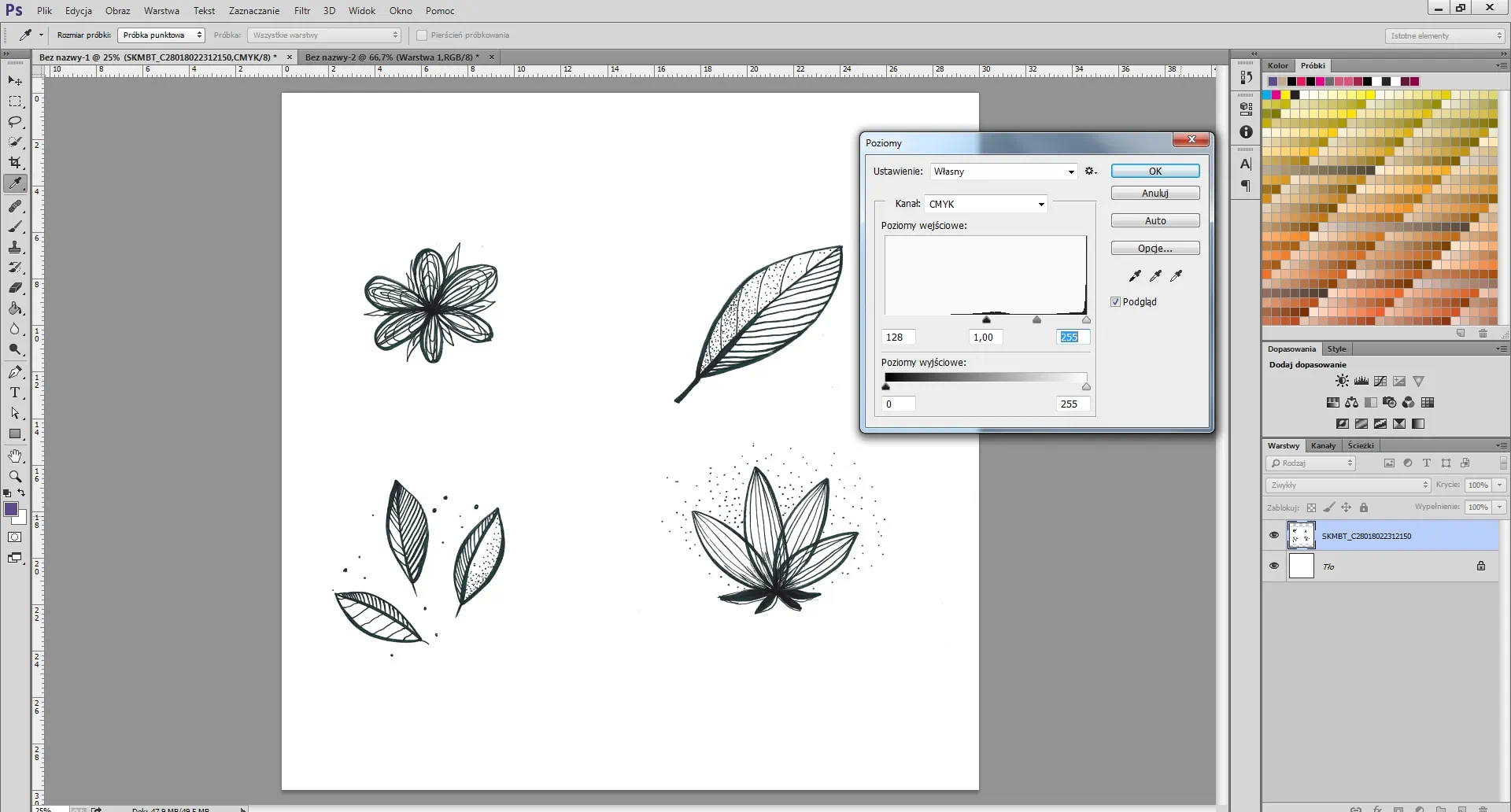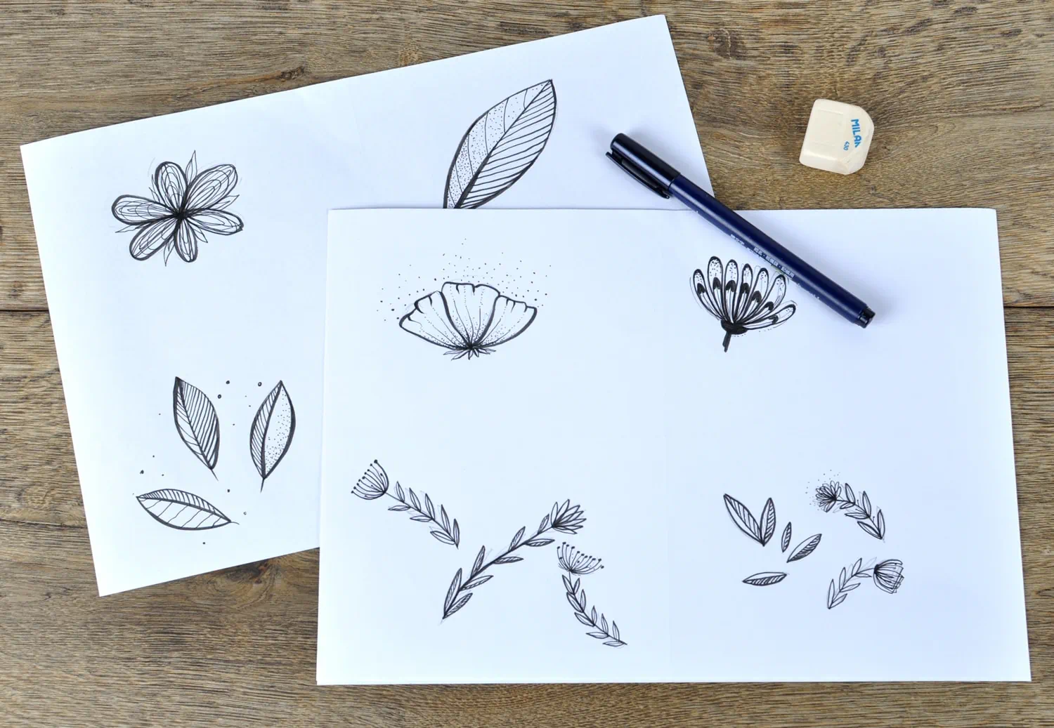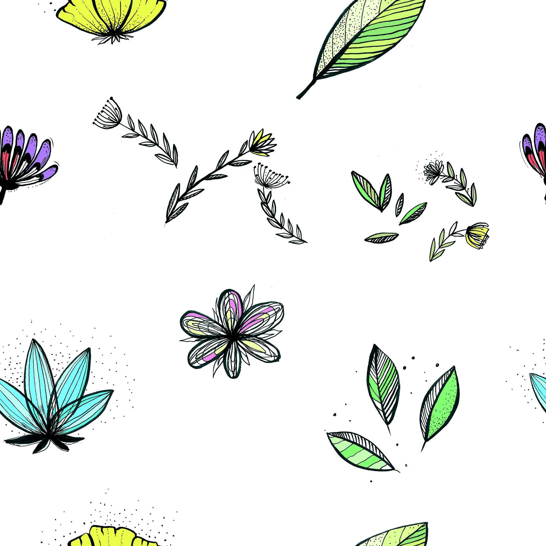 Para iniciar este tutorial de cómo diseñar un patrón sin costuras, dibuja algunos elementos en una hoja blanca. Hemos elegido flores: no hay nada mejor que un patrón floral ligero. Siéntete libre de dibujar lo que quieras. Usa un marcador negro grueso para facilitar el escaneo: las imágenes escaneadas se ven mejor cuando los elementos son claros. Si usas un lápiz para dibujar, retiñe con marcador y borra los dibujos en lápiz antes de escanear. Luego, escanea tu imagen a una resolución de 300 ppp .