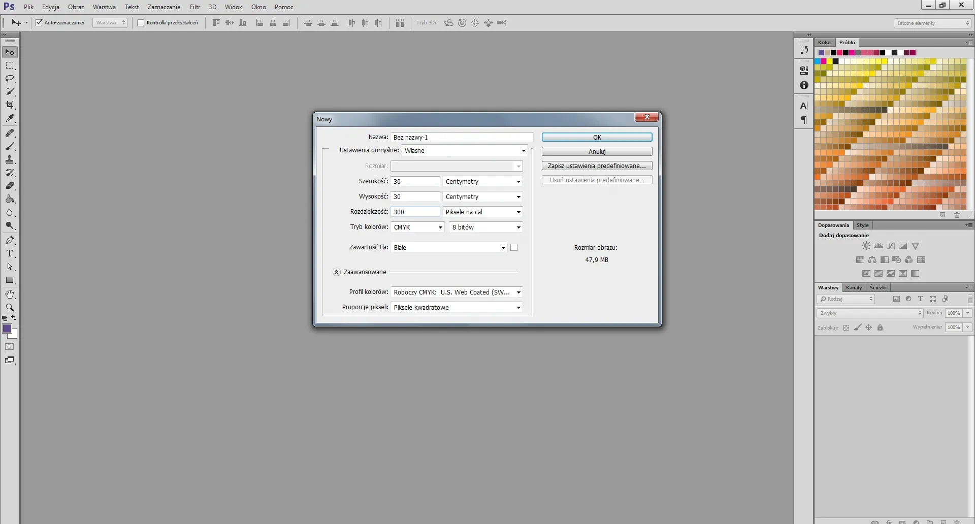 Ahora algunas pautas técnicas: establece los parámetros de archivo adecuados. Crea un nuevo archivo de Photoshop a 300 ppp. Preparamos un archivo de 30×30 cm que en píxeles tiene un tamaño de 3543×3543 px. Ten en cuenta que el archivo debe tener un mínimo de 150 ppp. Si deseas imprimirlo en papel o tela, debe elegir CMYK como modelo de color.