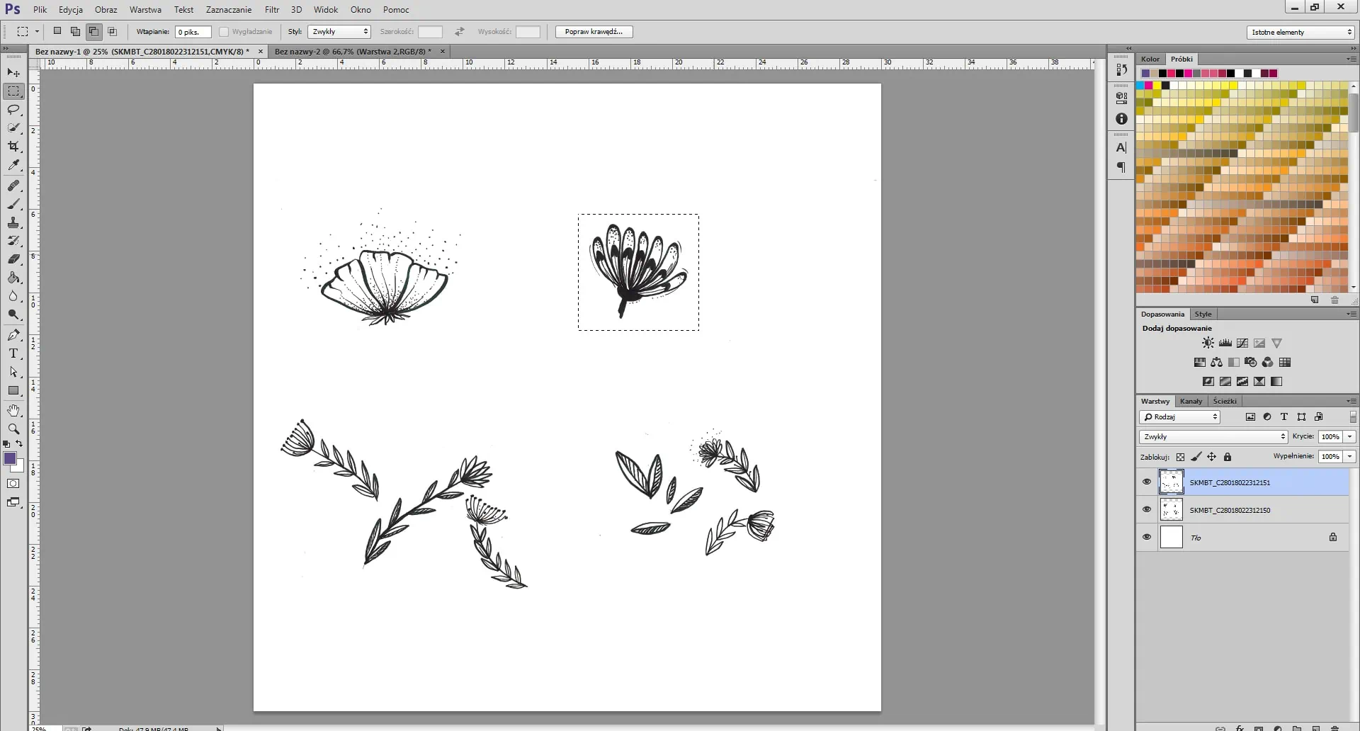 Corta todos los elementos de la imagen de la capa (en nuestro caso, flores) por medio de Herramienta Marco Rectangular. Se utiliza para marcar elementos de imagen. Luego, haz clic en CTRL+J para cortar un elemento; ahora se convierte en una capa separada. Repite el mismo procedimiento con todos los elementos y apaga la capa con el escaneo en la parte inferior derecha, dejando solo las flores.