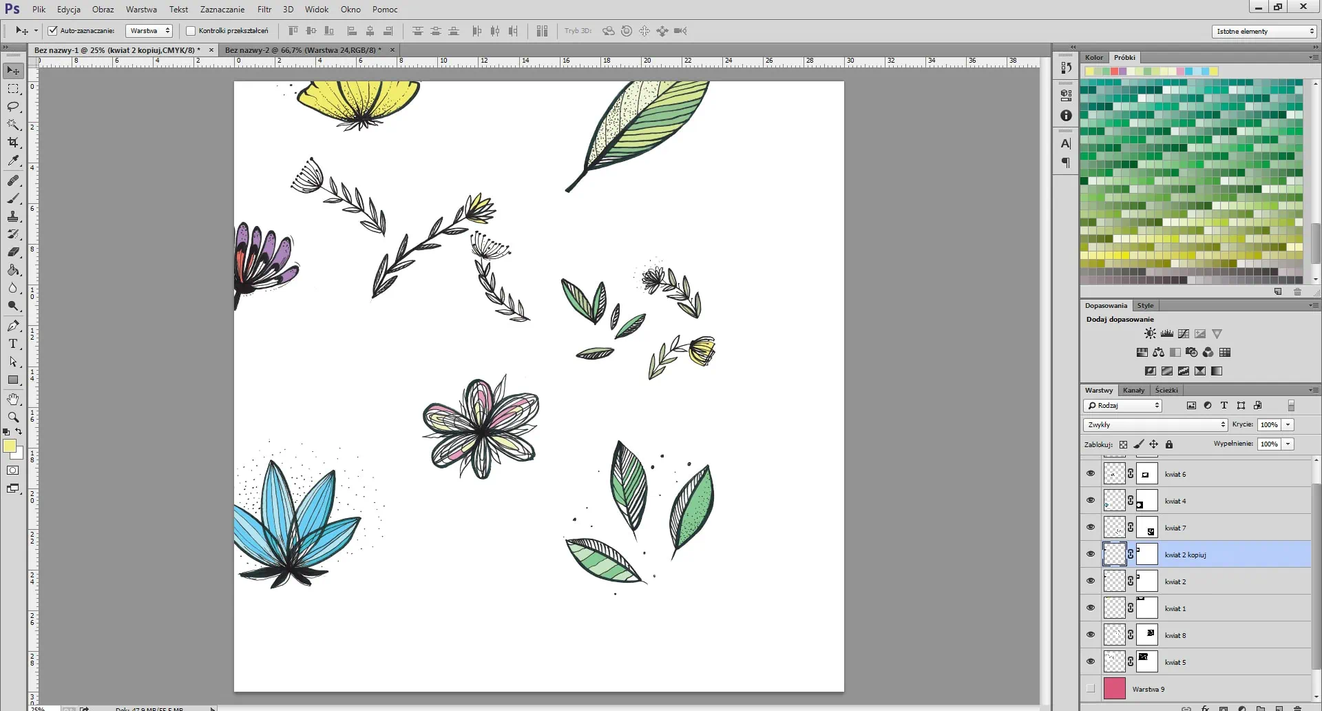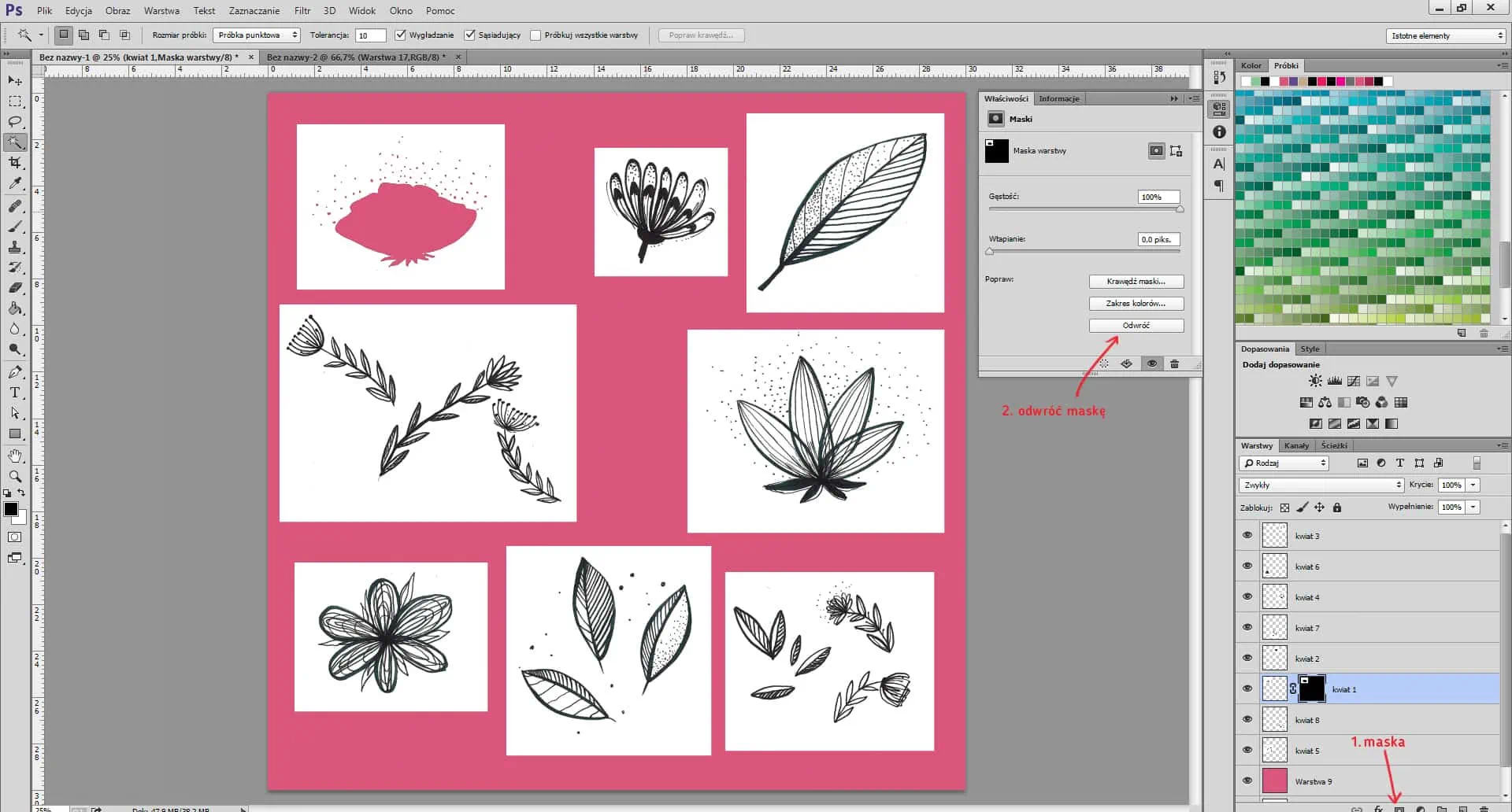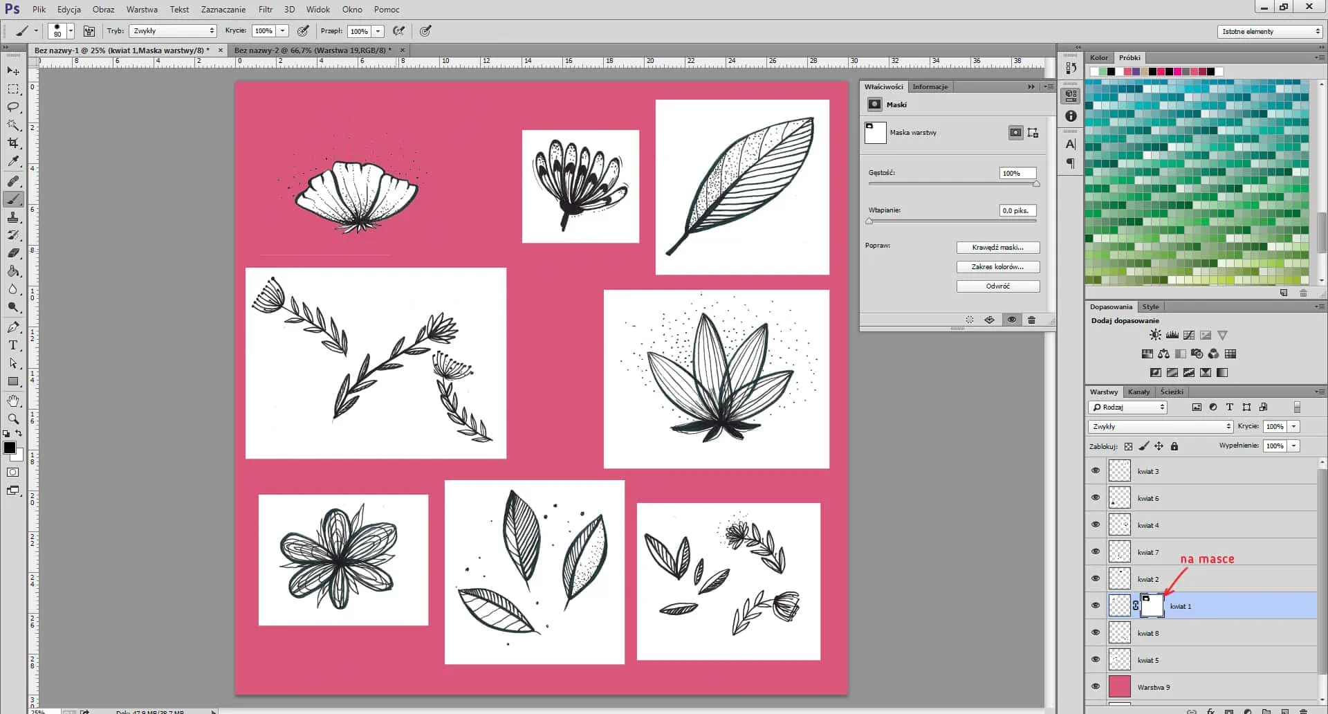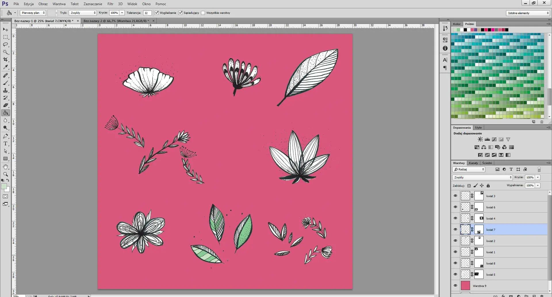 Desactiva la capa de fondo (en nuestro caso, la rosa pero puedes elegir otro color). Desplaza algunos de los elementos a la parte superior y al borde izquierdo del archivo. Se colocarán en el lado opuesto del archivo. Estos son los elementos terminales del patrón.